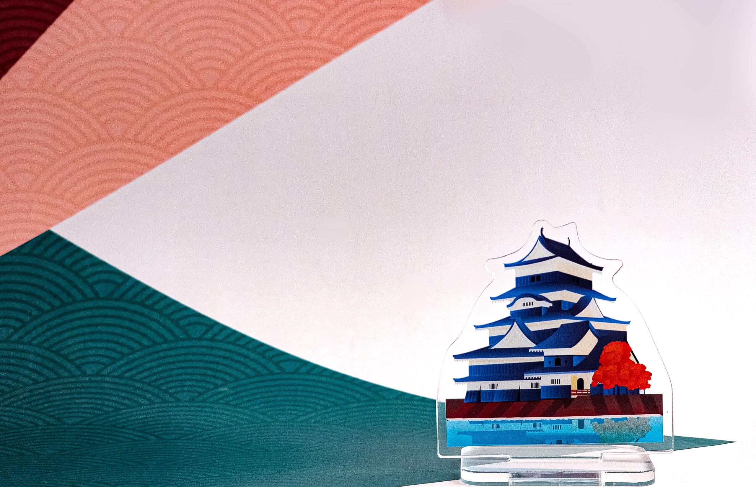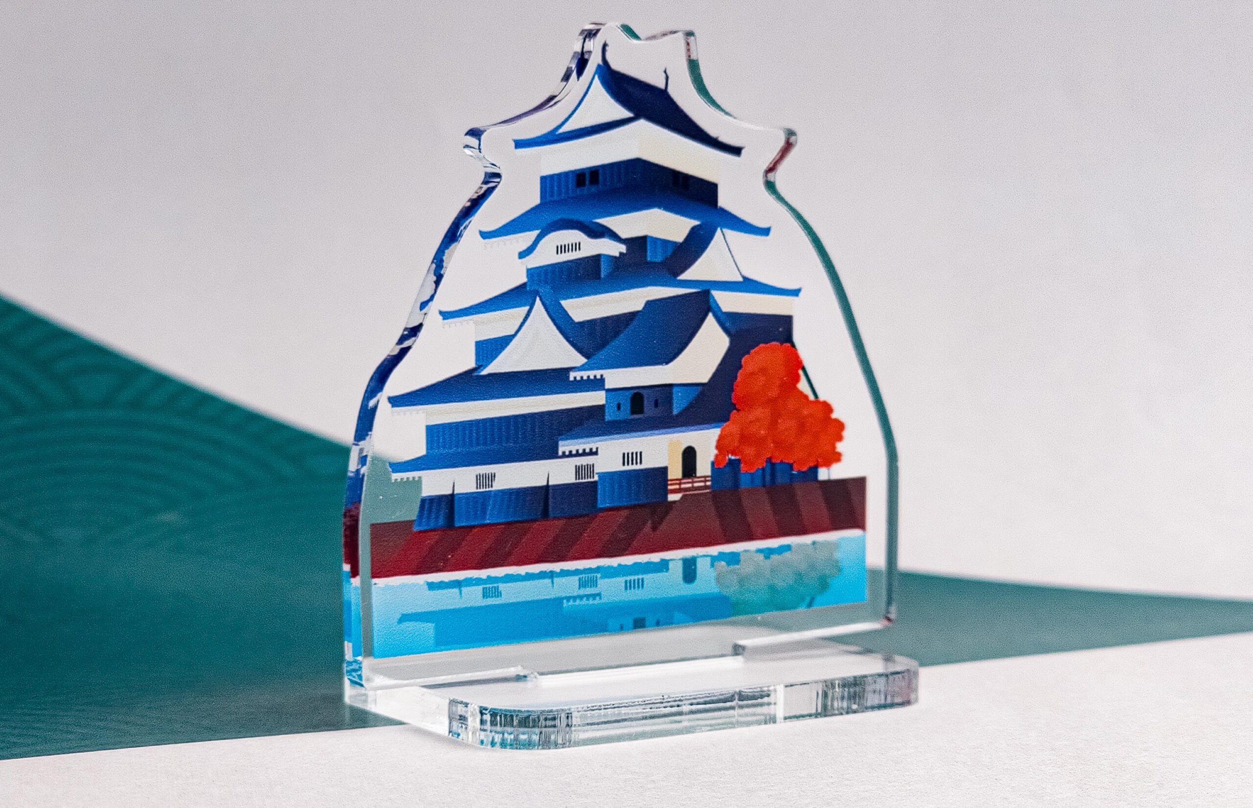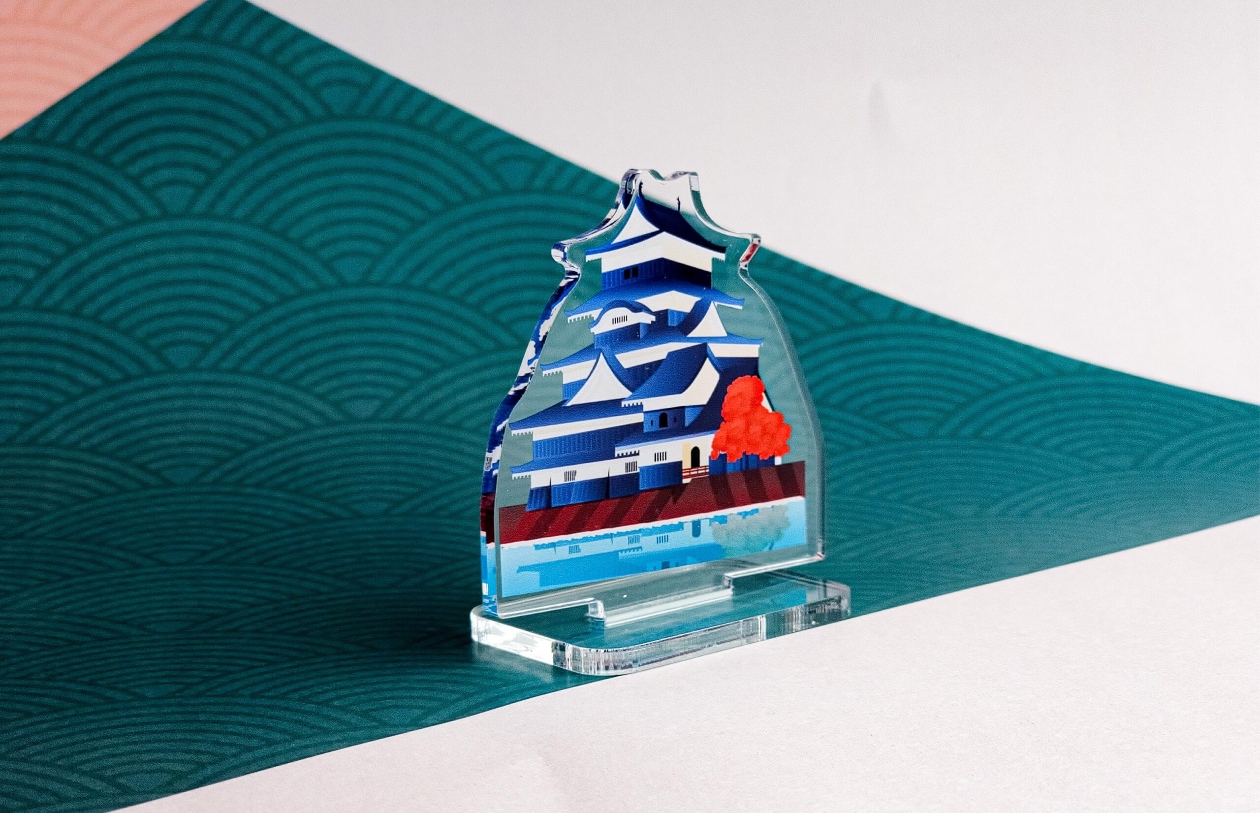 今回のデザインは、お城をモチーフにしたイラストで、子供から大人まで楽しめるデザインに仕上げました。海外の観光客の方も思わず手に取りたくなるような親しみやすさと、飾って楽しめる仕上がりを両立したアクリルスタンドです。