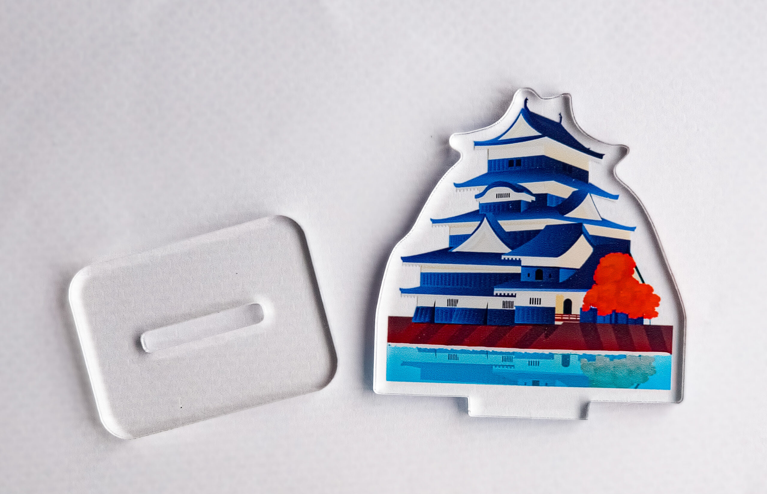 また、お城のイラスト部分には白+カラー4色で印刷をし、レーザーカットで形状に合わせてカットしています。アクリルスタンドはレーザーカットを使うことで、基本的にどんな形状にもカットが可能です。キャラクターや建物、ロゴマークや文字など、形状に合わせた形にカットすることで仕上がりのクオリティも上がりオリジナリティ溢れるノベルティが制作できます。