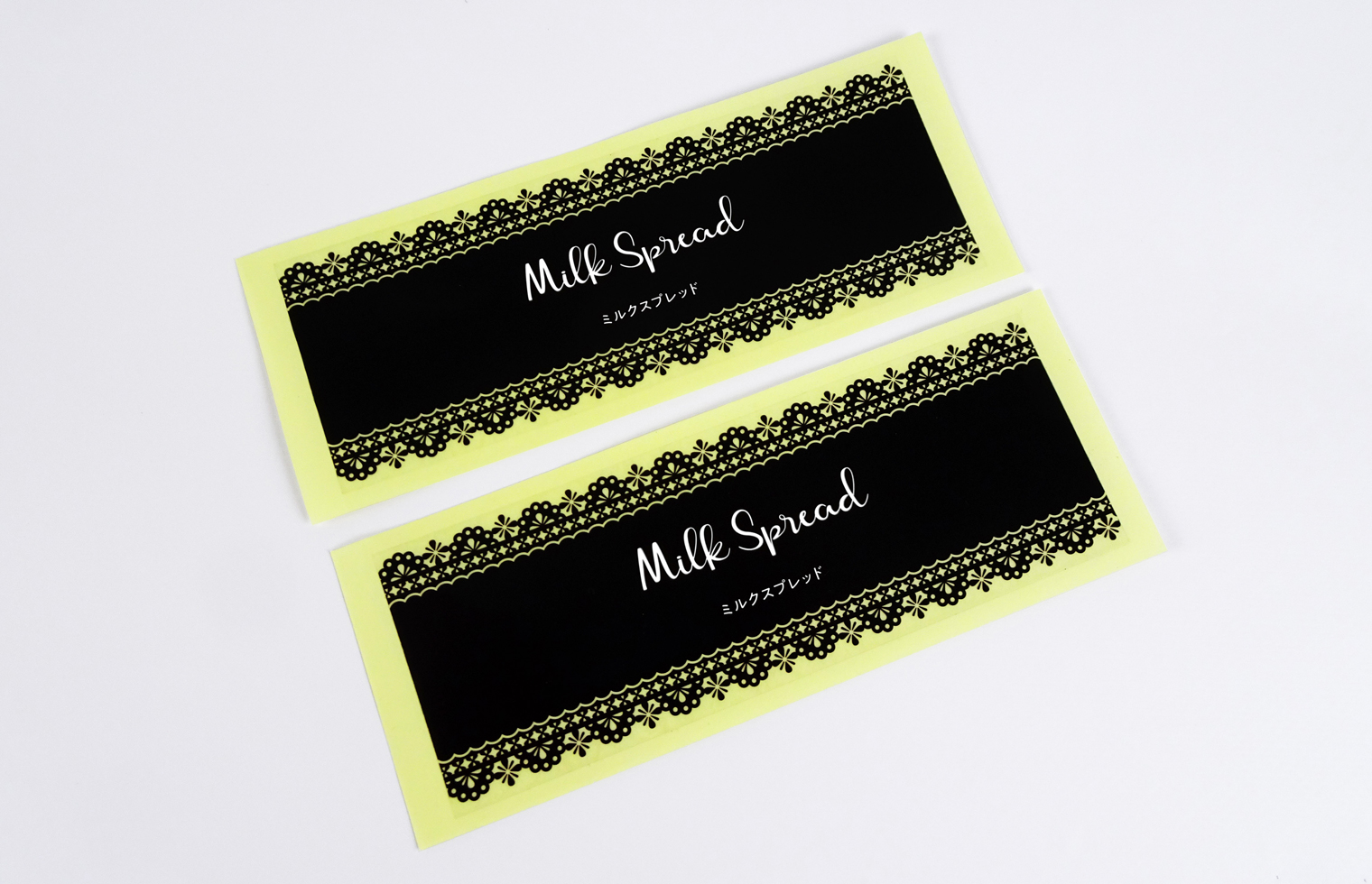 そこで、レーザーカット加工を行わず、レーザーカット加工風に見えるラベル・シールを制作しました。高透明ラベル素材のフジクリアに細かなレース調のデザインを施して、レーザーカット風のミルクスプレッド瓶ラベルの制作事例です。