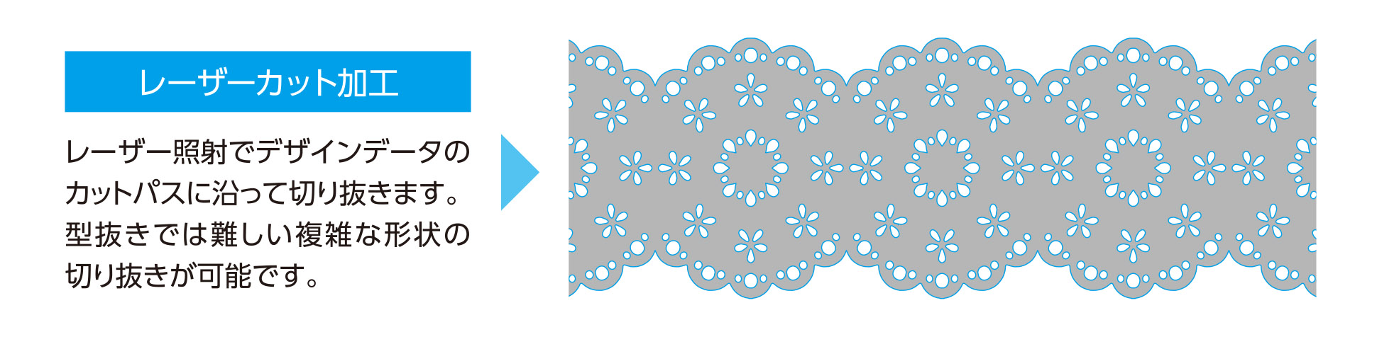 金型を使わずレーザー光を照射して素材を非接触で切り抜く加工方法。刃型が不要なため、金型代がかからず、少量生産や複雑なデザインのカットにも柔軟に対応できるのが特徴。