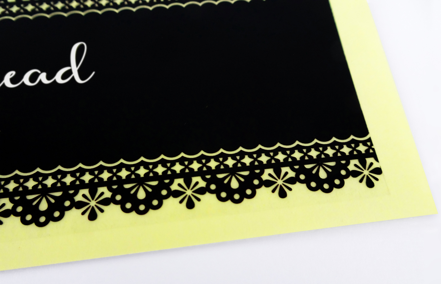 実際に手に取っていただくと、「まるで瓶に直接印字されいるよう」「繊細なレースを切り抜いたように見える」といった印象を与えることができます。透明度がとても高いフジクリアと繊細なデザインを活かすことで、このようなラベル・シールを制作できるのです。