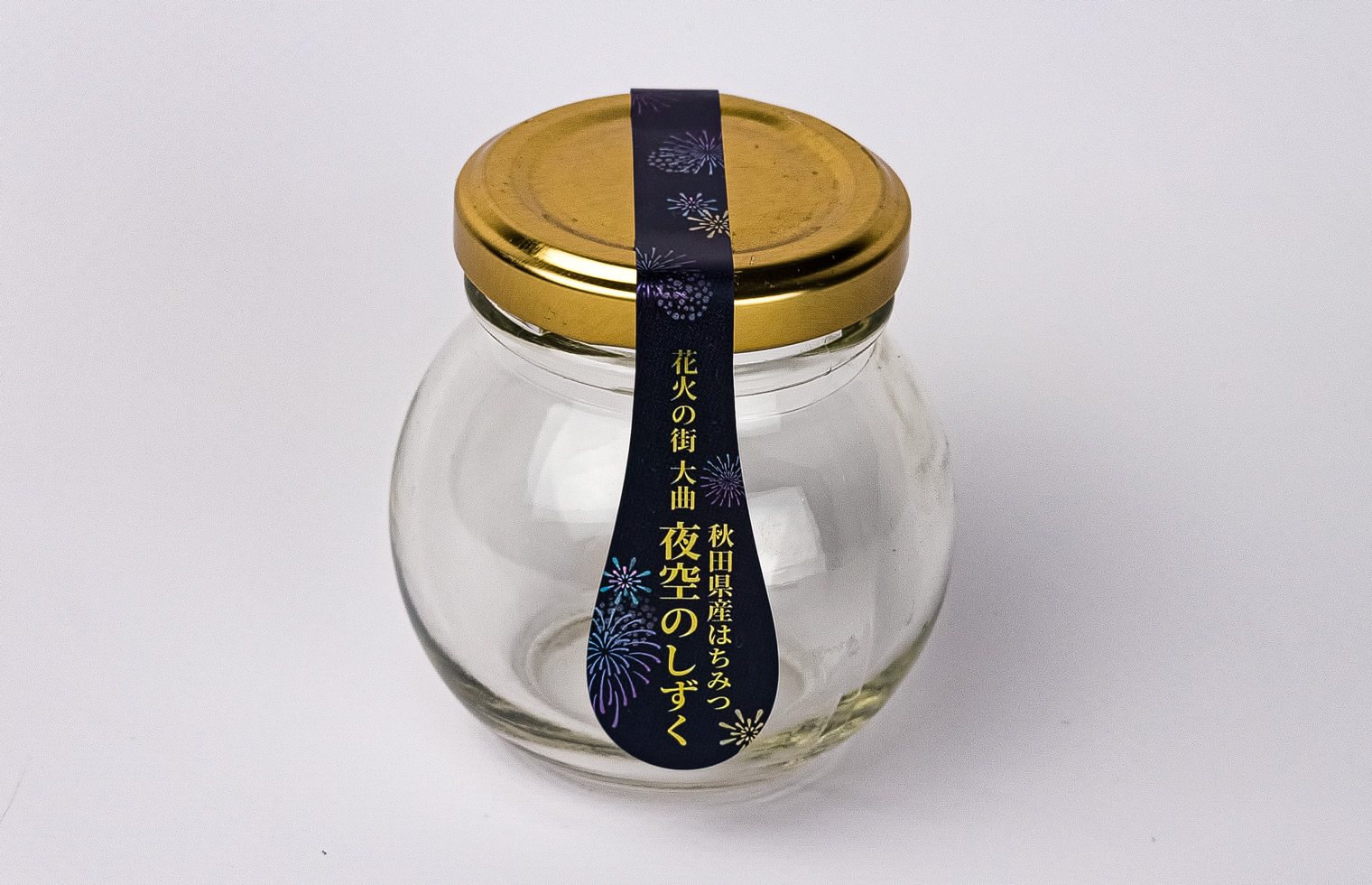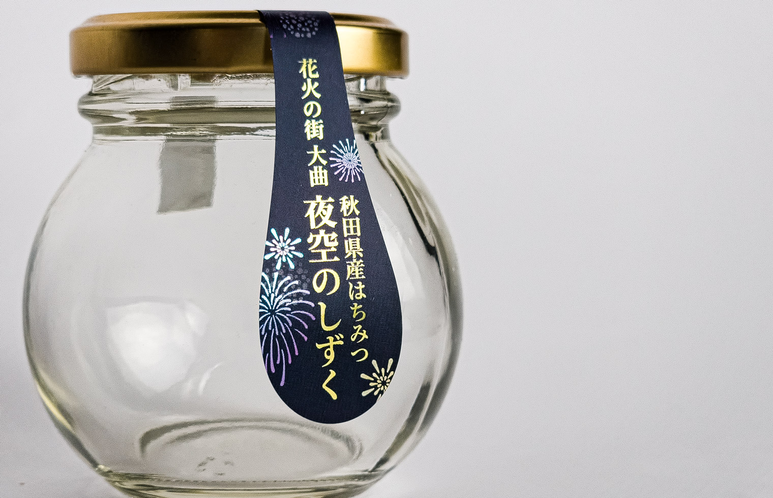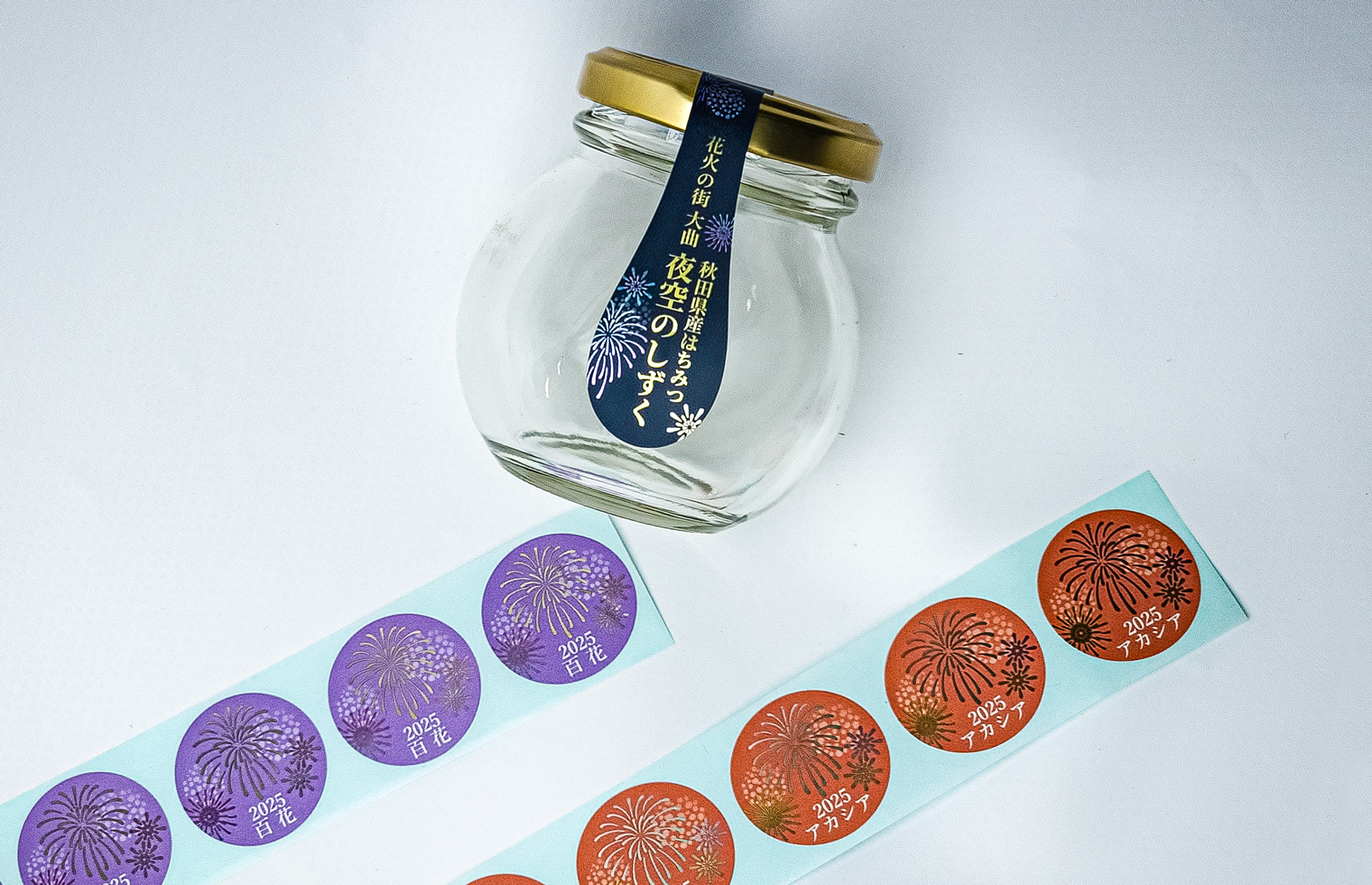 夜空の花火をオフセット印刷でキレイに表現!封緘シールと兼用させたはちみつ瓶の商品ラベル
