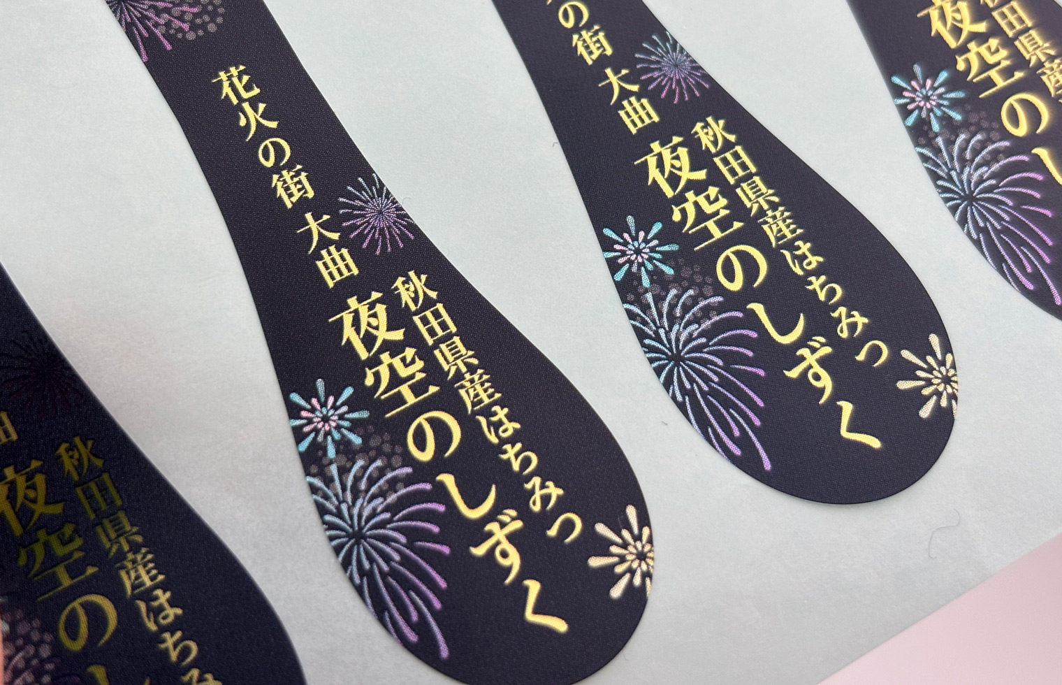 また、印刷はオフセット印刷を採用しました。オフセット印刷は、細かなデザインや写真・グラデーションが得意な印刷方法です。今回のデザインである花火の部分もとても細かな網点やグラデーションで表現しています。多彩な色彩を得意とするオフセット印刷だからこそ、美しく花火を印刷することができました。背景の夜空の部分はあえて「黒」ではなく、「紫がかった紺色」としています。デザインとして重たくならず、瓶に入ったはちみつとの色のバランスも美しくなりました。