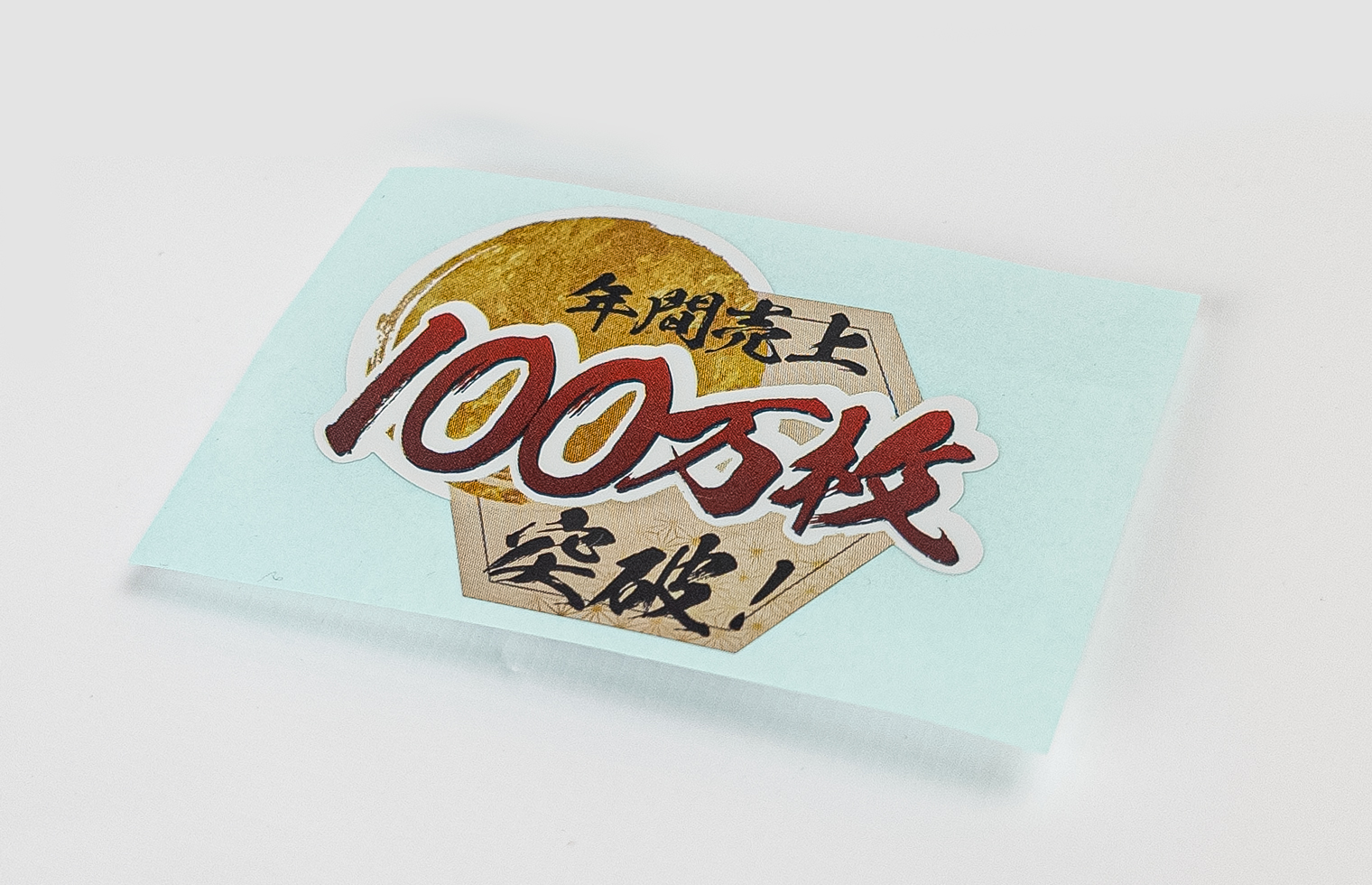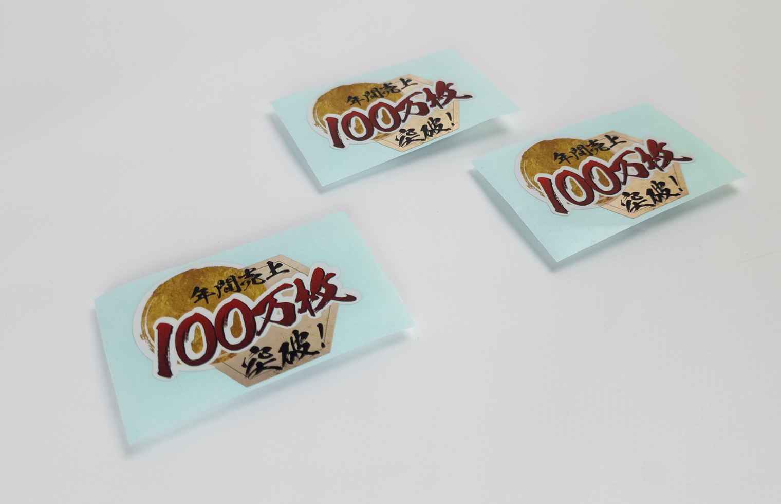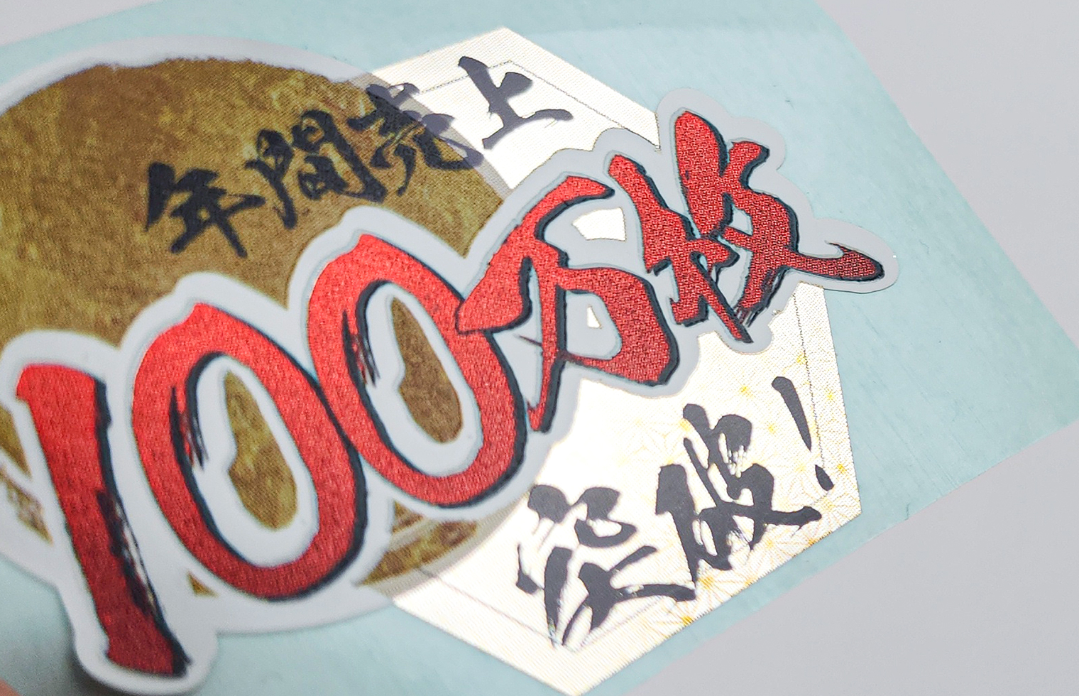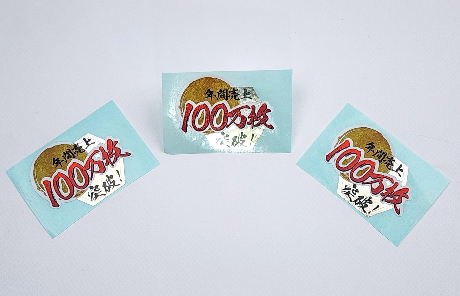 デザインデータはお客様よりご支給をいただき、下地の白印刷の部分、原紙のメタリックを残す部分、疑似エンボス加工をしてザラザラさせる部分といくつかのパターンを提案いたしました。最終的に、バックの丸いイラストと「100万枚」の部分を疑似エンボス加工、六角形の背景をメタリック仕上げのデザインを採用しました。視覚的にも質感的にもメリハリのある、存在感のあるアテンションシールが制作できました。