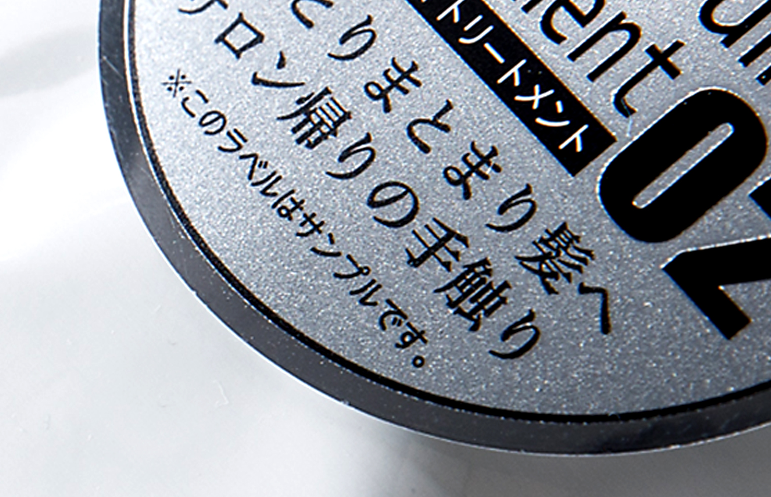 アテンションシールの原紙には、キラキラとシルバーの光沢感のあるツヤ銀ネーマーを採用。印刷は下地に白を印刷することでメリハリをつけ、カラー4色印刷に疑似エンボス加工としています。原紙のメタリックな輝きと、疑似エンボス加工でコントラストを付けることにより、高級感と立体感のあるラベルを目指しました。